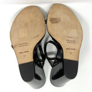 The sleek black patent finish makes them versatile for pairing with dresses, skirts, tailored pants, or even jeans for a polished look. Ideal for fashion-forward women who appreciate high-end craftsmanship and statement footwear, these Prada wedge sandals also work well as part of a vacation wardrobe or travel shoe collection. Size 37 EU (approximate US 6.5-7).