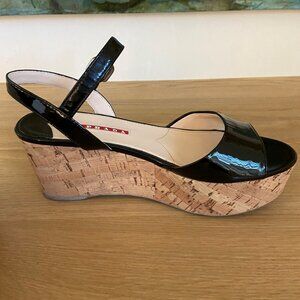 Prada Black Patent Sandals With Cork Wedge 36.5