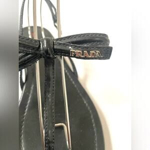 Prada Black Patent leather bow tie logo embellished T strap flat sandals EU 39.5