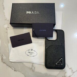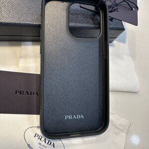Elegant Prada phone case. Sleek black design. Features iconic logo.