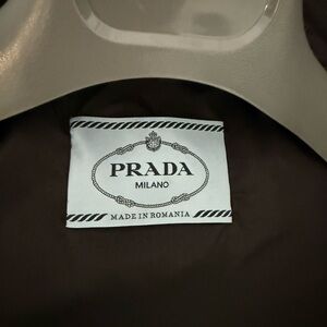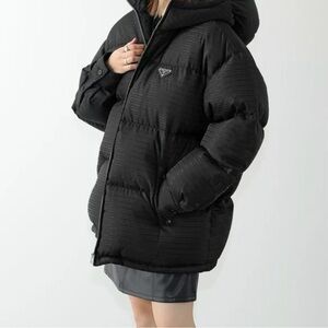 Elegant black puffer by Prada. Features a sleek design. Ideal for cold weather.