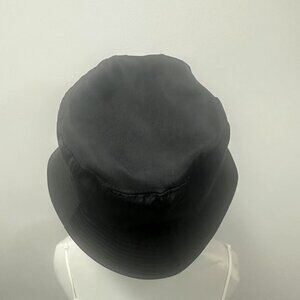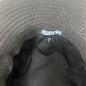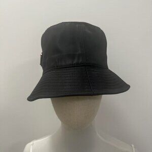 Stylish black bucket hat with quilted design. Features iconic Prada label.