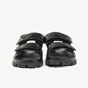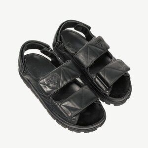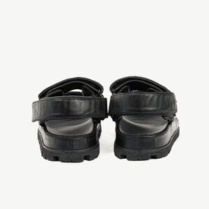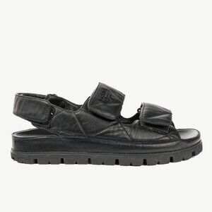 Made in Italy, these utilitarian sandals from Prada are crafted in a Black luxe lamb leather with diamond-quilted detailing, and feature open rounded toes, Velcro straps, tonal logos, a Velcro slingback strap, leather lining and insoles, and flat rubber outsoles.