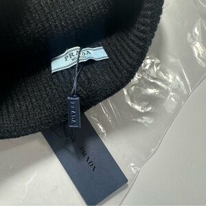 Chic Prada beanie in ribbed knit. Features signature logo patch. Ideal for stylish warmth.