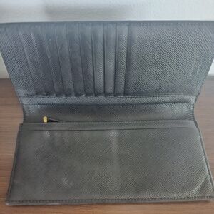 This document holder is defined by stylish Saffiano leather paired with an enameled triangle logo on the front. It opens to a zippered pocket, fabric lining and thirteen credit card slots.