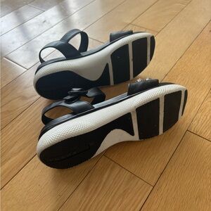 Prada sandals in black. Pink and crystal floral embellishments. Very comfortable.