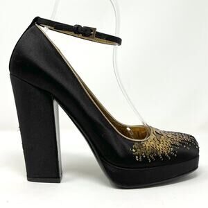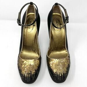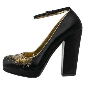 Prada Black Satin Gold Sequins Embellished Mary Jane Platform Pumps