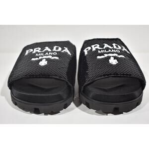 Prada Black Sequin White Logo Slide Sandal Slip On Pool Flip Flop Flat 39