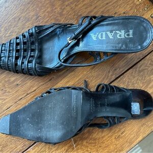 Chic black strappy kitten heels by Prada. Perfect for elevating any outfit. Newly resoled. Vintage.