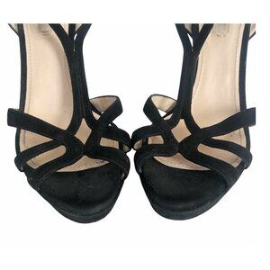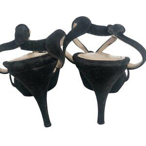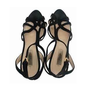 Prada women's black suede open top platform strappy stiletto sandals. Sandals have an adjustable ankle strap, 1" platform and 5" heel. They no longer have size tag but I had my friend try them on. She's a true size 7 and they fit her perfectly.