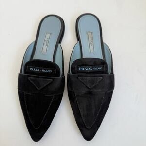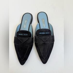 Prada Black Suede leather logo slip on slide loafer mules EU 37 Excellent preowned condition