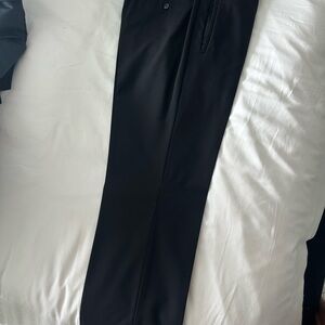 • Trousers: Flat front, zip and button closure, belt loops, side slit pockets, and back welt pockets.