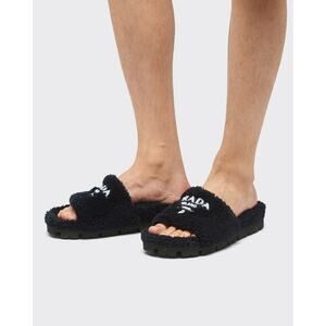 Name: Spugna Color: Nero + Bianco Style: Slides Material: Terry & Rubber Open front toe White Prada logo Black terry cloth fabric material