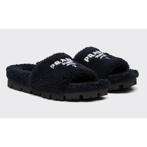 Name: Spugna Color: Nero + Bianco Style: Slides Material: Terry & Rubber Open front toe White Prada logo Black terry cloth fabric material