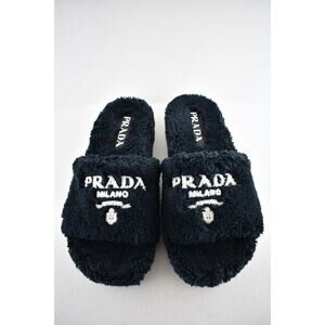 Prada Black Terry Cloth White Logo Slide Sandal Rubber Flip Flop Flat UK12 US 13