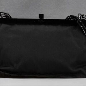This Prada shoulder bag in sleek black showcases a sophisticated structured frame, embodying timeless elegance. Crafted with precision, it features subtle silver hardware that enhances its minimalist appeal. A perfect accessory for those who value luxury and style.