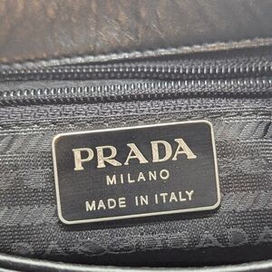 Classic Prada nylon tote in black Tessuto with leather-trimmed top edge and straps. Features interior “PRADA Milano Made in Italy” plaque. Clean fabric interior with zip pocket. Light corner wear and minor scuffing on base edges. Includes no straps or extras.