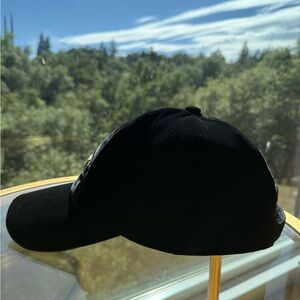 Elegant black velvet cap featuring a gold Prada emblem. Ideal for adding a touch of luxury to casual wear.