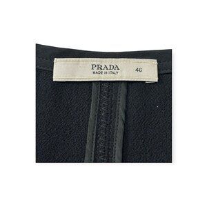 Elevate your wardrobe with this elegant Prada black A-line skirt, crafted in Italy from 100% virgin wool. This timeless piece features a grosgrain ribbon trim near the hemline with a delicate bow accent, adding a touch of sophistication. The skirt has a flattering A-line silhouette with unfolded hem for subtle femininity. Side zip closure ensures a clean finish. Perfect for both office wear and evening outings.