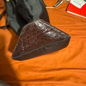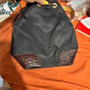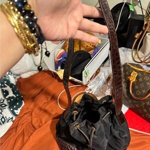 Stylish Prada bucket bag in black with brown accents. Features a drawstring closure and textured details.