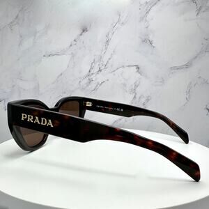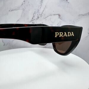 Chic Prada sunglasses with a bold black frame. Features brown lenses. Iconic gold Prada logo on the temples.