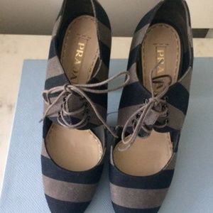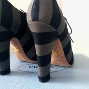 These are fabulous black/grey striped mary jane style pumps. Great for any workplace and for after work! The grey has a slight tinge of green to it as well that makes it very distinctive. These have been slightly used and there are some scuffs on the soles. They come with their original box. These are a great finish to any outfit! Ask any questions.