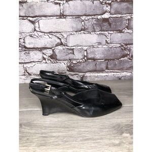 Selling Prada Black Patent Leather Peep Toe Wedge Strap Sandals Women’s Sz 36EU/5.5M US