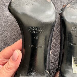 Prada Blue, Black, and Brown Grosgrain Striped Heels with Ankle Strap and Bow. These shoes are black with a blue, black, and brown striped grosgrain band with a small black bow. The heel is thin. They are in good condition with some wear on the bottom.