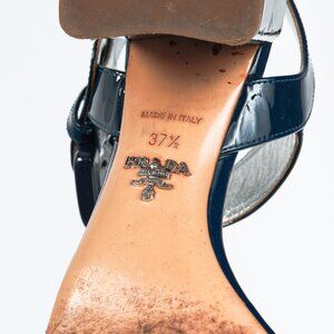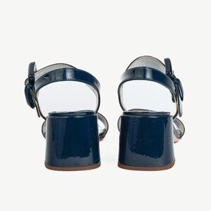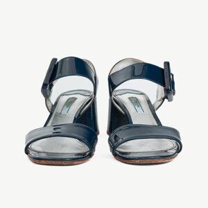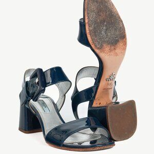 Made in Italy, these sandals from Prada circa 2015 are crafted in a dark blue patent leather, and feature covered block mid-heels, open rounded toes, ankle straps with oversized tonal buckles, and leather lining and soles.
