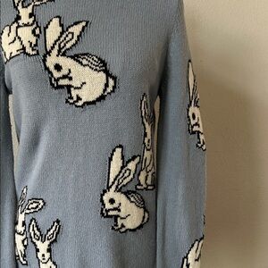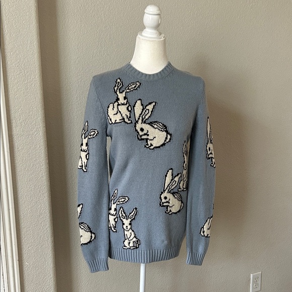 Authentic Prada sweater with playful rabbit intarsia. Soft blue wool base. Cream rabbit motifs with black outlining. Classic crew neck and ribbed cuffs. Chic and whimsical designer knit.