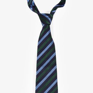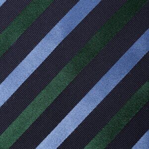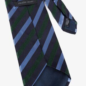 Made in Italy from 100% silk, this tie from Prada features navy-blue background with medium blue and green stripes.