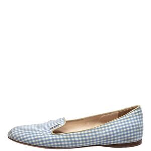 These blue and white loafers by Prada are stylish and comfy. Made from check canvas, they feature round toes and gold tone brand logo detailing on the vamps. The insoles are leather lined for comfort and overall, the pair exudes a fashionable vibe.