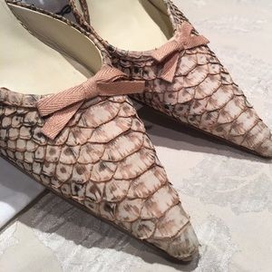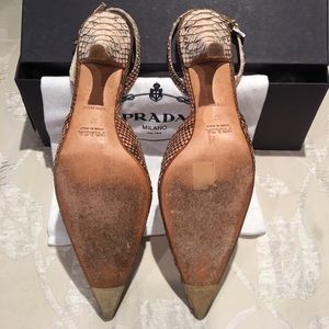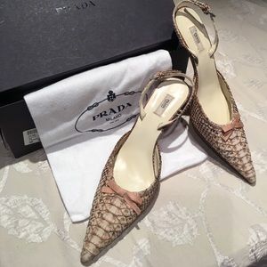 Luxury and sexy classic Prada Blush Python pointed toe heeled sling backs. Great texture and in great condition. Adjustable sling back with classic Prada brushed nickel small elegant buckle. Size 7 and will fit if you are a 6.5 but not 7.5 unless you are a narrow. Heel is approx 3" or tad less. Comes with original Prada box if you want, a duster and booklet. No trades