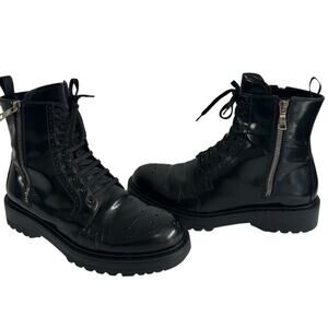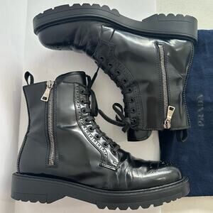 Prada Brogue Combat Boots Shiny Black Leather Lace-up & Double Zipper EU 38