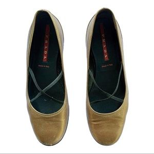 Bronzo (Bronze) Prada Calzature Donna Old Metal ballet flats, size 38 EU (7.5 US). Genuine metallic leather upper, rubber soles, criss cross elastic straps for comfortable fit. Moderate wear on soles. Slight scuffing at toe of right shoe and small scuffing at heels, please reference all photos for condition. All measurements are approximate and shown in last photo. Authenticity card, box, and dust bag included.