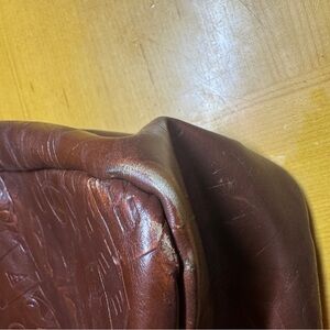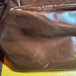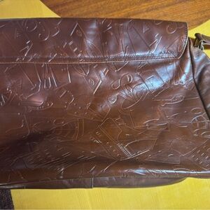 PRADA vintage leather handbag , made for luxury department store John Wanamaker. Brown leather with impressions of buildings, airplane, ship and captain, golf clubs. Fold over snap closure. Burgundy Prada insignia lining. Labeled Prada for John Wanamaker Made in Italy. 1 zippered interior pocket and one front exterior pocket under flap. Adjustable strap. Bag measures 13.5 x 8.5 in. Clean inside and out. Minor wear shown in photos.