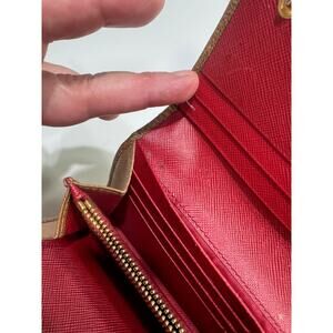This Prada wallet is vintage and shows signs of distress and wear. It's the perfect accessory for the discerning individual who appreciates quality and style. Don't miss out on the opportunity to own this beautiful Prada wallet!