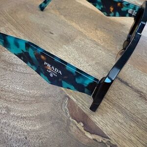 Stylish Prada sunglasses with a bold square frame. Perfect for a modern look. Has a scratch on right lens.