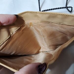 Interior shows slight discoloration as well as staining. There is marking inside the bill pocket also. Has 6 credit card slots, bill slot and a zip close change pocket on opposite side. Change pocket has some aging and signs of use.