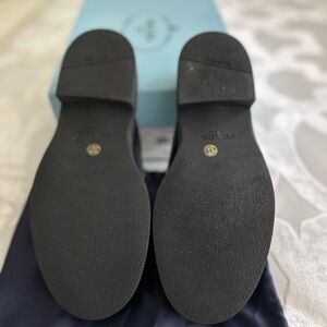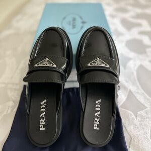 Glossy black leather mules with signature Prada logo. Modern and chic.