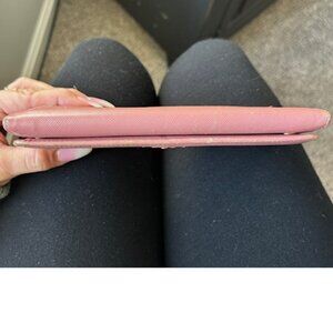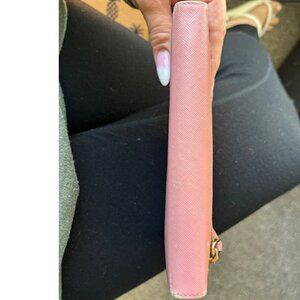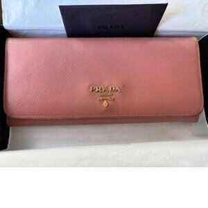 Authentic and beautiful Prada wallet in Camelia (blush) saffiano leather. Comes with original box and COA. Shows signs of wear and some staining on exterior and interior. Buttons are still snappy and coin pocket zipper is still zippy! Overall this is in GOOD condition and is CLEAN. Still has a lot of mileage left.
