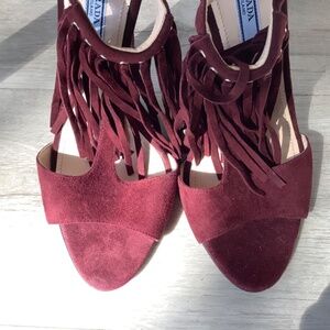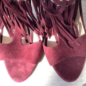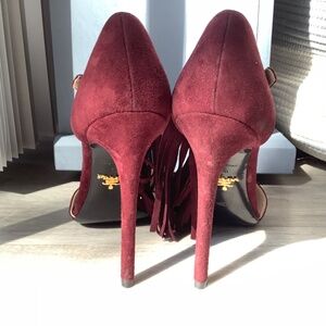 Prada Camoscio Amaranto High-Heel Suede Fringe Sandal Prada suede sandal. 4 1/2" covered heel. T-strap vamp with fringe and grommet detail. Adjustable side buckle. Leather lining and sole. Made in Italy.