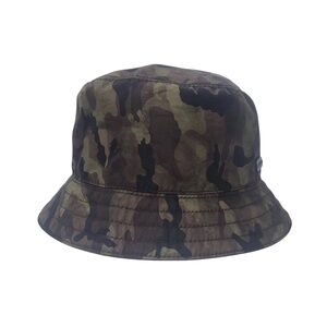 Vintage Prada green and brown multicolor camouflage print nylon bucket hat with leather logo placard at exterior.