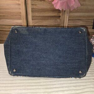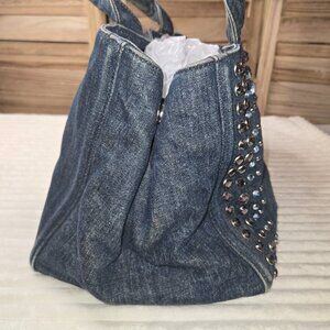 Gorgeous bag - even better in person! The Prada Denim Canapa with Crystal Studs is a stylish, standout handbag featuring a blend of casual denim and glamorous embellishments. I added an unbranded silver chain to the d-rings to use as a crossbody strap.