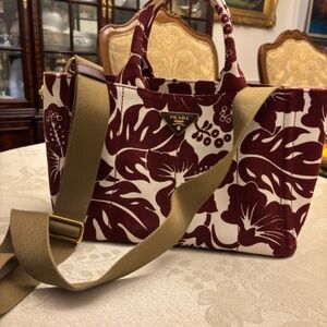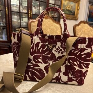 Prada Canapa Small Tote Bag – Burgundy & White Hibiscus Print