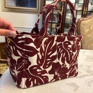This authentic Prada Canapa Small Tote Bag features a striking burgundy and white hibiscus floral print on durable canvas. The bag is in barely used condition, showing minimal to no signs of wear.