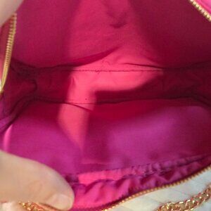 Never used Prada Candy pouch measures 10" x 7" x 2 1/2". Beautiful Barbie-pink color has D-rings added with gold strap for a crossbody. Prada hardware still has plastic on it.