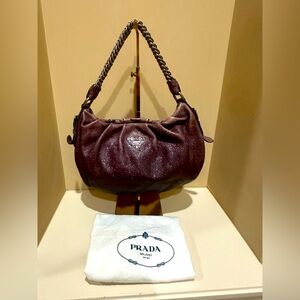 Vintage used condition Prada Dark Purple Leather Hobo Handbag. Has some fading by of the color and a couple of scratches as shown as this is a Preloved piece. Measurements are in the photos. Clean inside and out. Serials are in the photos as well. The chain strap is a really cool unique feature that stands out on this bag and really well made. It comes with the original dustbag and authenticity card as well. Thanks for looking!
