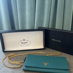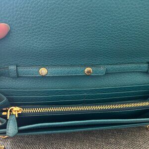 Soft leather clutch with gold tone hardware and a removable strap, making this a very versatile bag! Interior zip pocket with six card slots, snap front. I am 5'4'' and the bag hangs to the bottom of my hip. Can also wear crossbody. I have only carried this bag on one or two special occasions so it is like new! Vitello Grain material, Color: Ottanio