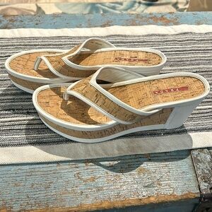 Take out beach hat and get ready for some adventures in this Prada platform wedges. With a full vacation vibe in check, these wedges are styled into a thong upper with white leather trims and a cork platform wedges keeping the look on these slip-on sandals well balanced.